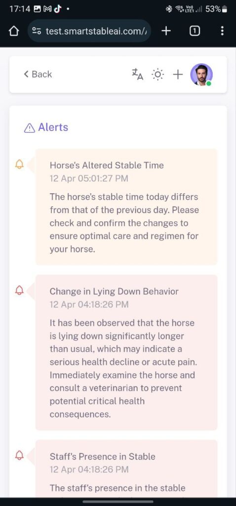 SmartStableAI שולחת התרעות חכמות בזמן אמת, מאפשרת מעקב מרחוק אחר מספר סוסים במקביל, ומעניקה תמונה ברורה ומרוכזת של מצב האורווה – כך שכל מי שאחראי על הסוסים יכול לקבל החלטות מהירות ומדויקות יותר.